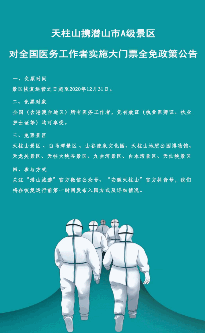 天柱山攜潛山市A級(jí)景區(qū)對(duì)全國醫(yī)務(wù)工作者實(shí)施大門票全免政策公告