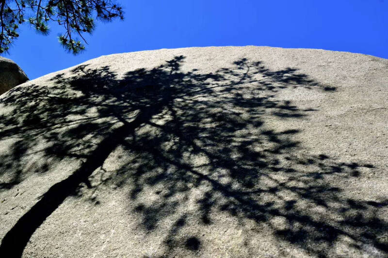 這些生長在石縫里的松樹,根部能夠分泌出一種酸性的物質(zhì),腐蝕石頭的表面,使其化出養(yǎng)分供自己吸收。為了從石頭里尋覓生機,也為了牢牢抓住絕壁,它們的根日日夜夜與石頭搏斗著,最終穿入堅如鋼鐵的石體,讓人感受到寧靜之中蘊藏的無窮力量。
