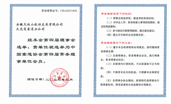 喜報!天柱山大龍窩索道當(dāng)選中國索道協(xié)會常務(wù)理事單位