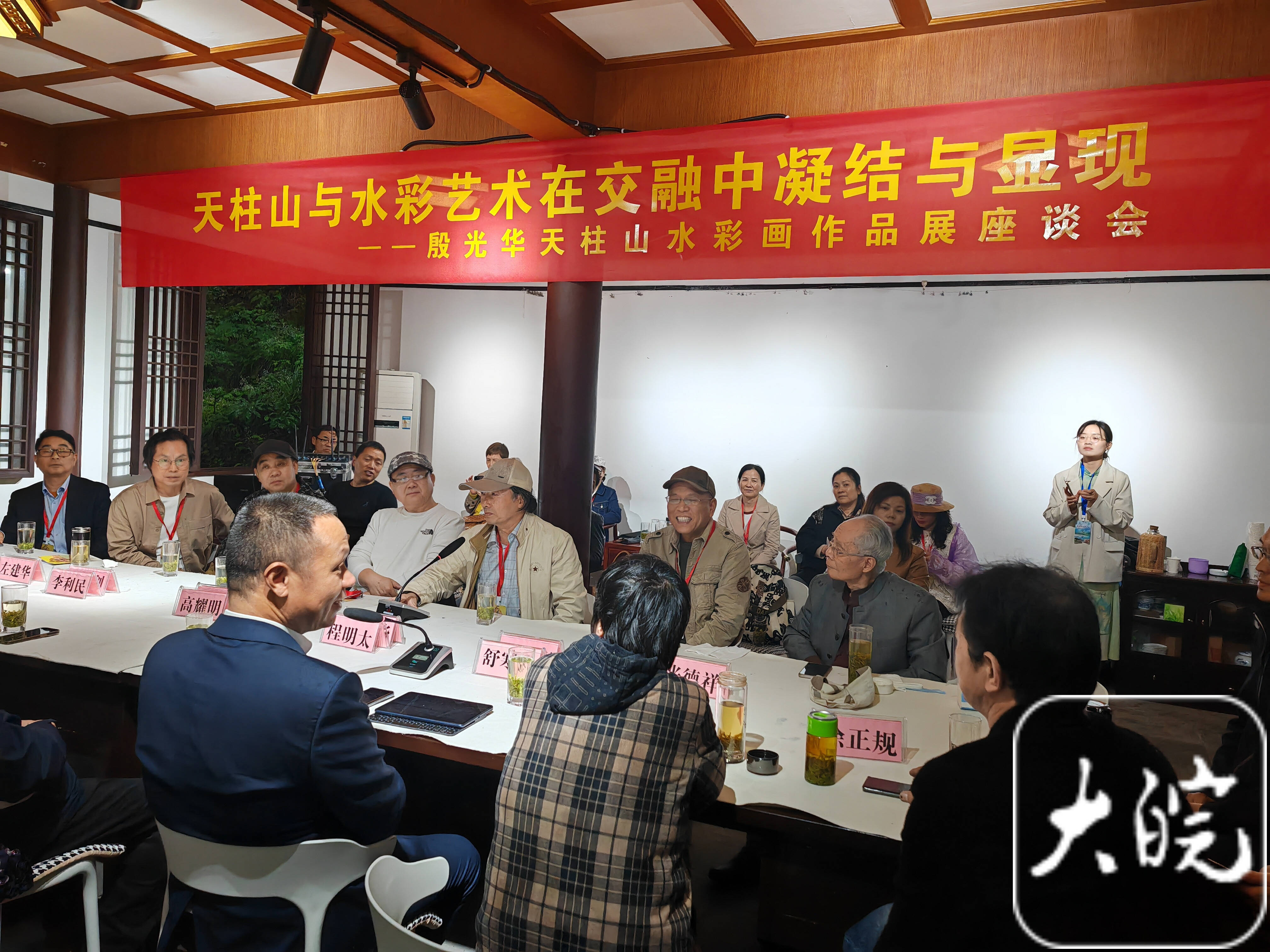 開(kāi)幕式上,天柱山管委會(huì)為殷光華頒發(fā)“天柱山駐山畫(huà)家”和“天柱山榮譽(yù)山民”證書(shū),并舉行殷光華天柱山繪畫(huà)工作室揭牌儀式。殷光華向天柱山管委會(huì)和地質(zhì)公園博物館分別贈(zèng)送一件作品,并獲贈(zèng)收藏證書(shū)。4日下午,就“天柱山與水彩藝術(shù)在交融中凝結(jié)與顯現(xiàn)”舉行座談。