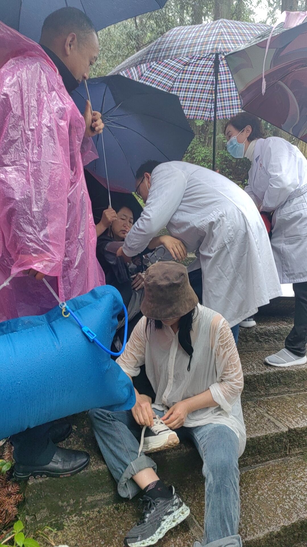 此時(shí)此刻,一場與時(shí)間賽跑的急速救援的暖心一幕,在天柱山景區(qū)真實(shí)上演。到達(dá)救援現(xiàn)場,游客高女士呈現(xiàn)心慌、四肢無力、全身發(fā)抖、不能言語、時(shí)有惡心等狀態(tài),醫(yī)生給游客認(rèn)真仔細(xì)地做了檢查,表示情況十分危急,需及時(shí)到山下醫(yī)院就診。劉星第一時(shí)間撥通120急救電話,隊(duì)員汪小曲冒雨把高女士從迎真峰背負(fù)至牧羊河索道上站,路程約四五百米,然后坐索道下山并將游客抬上救護(hù)車,送往潛山市中醫(yī)院就診,稍微歇停背負(fù)的汪小曲,已累得癱軟一旁,站立不穩(wěn)。